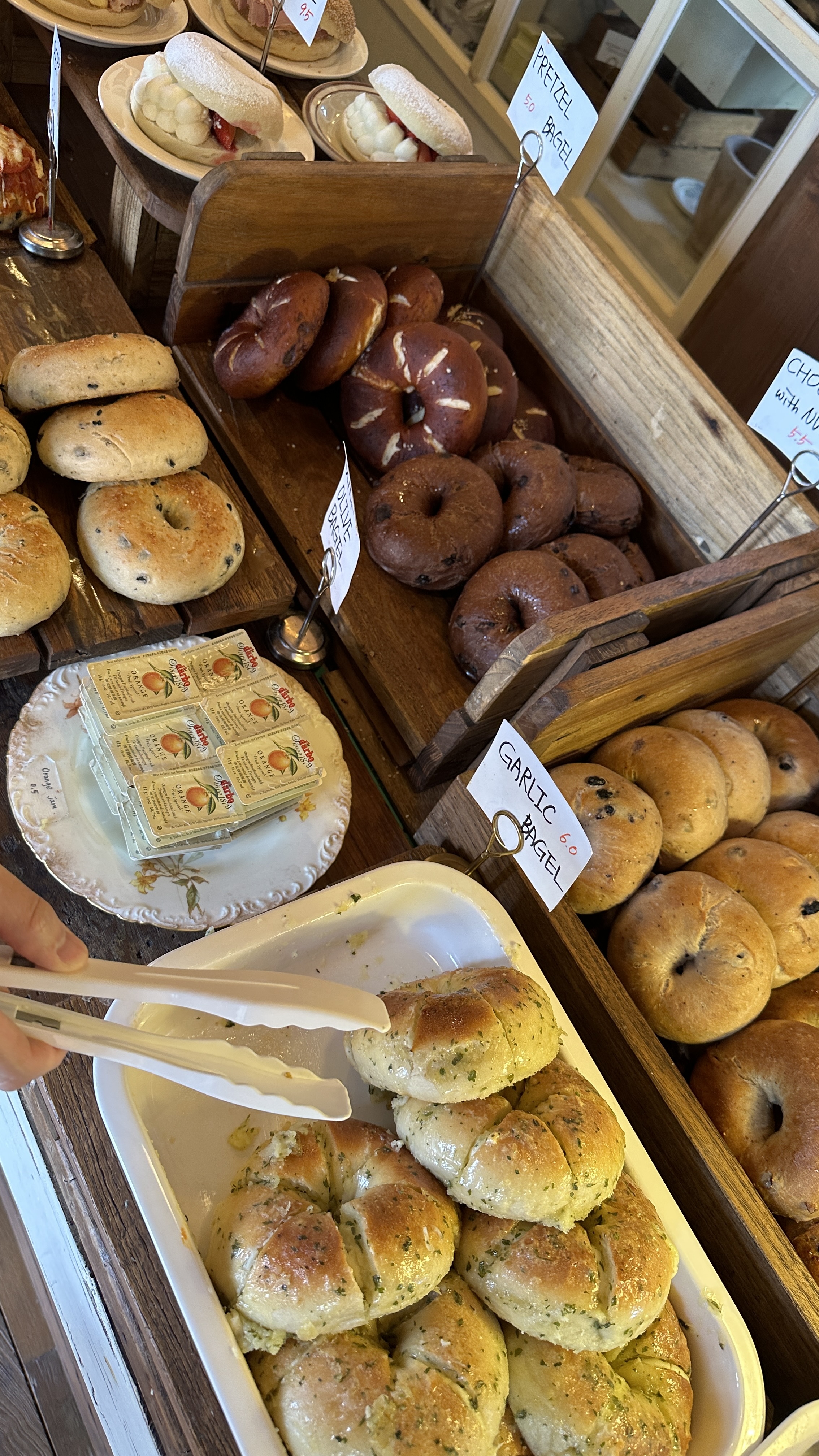 종류도 많고, 베이글 앞쪽으로 쭈-욱 줄서서 쟁반에 베이글을 담아 차례대로 주문했어요.