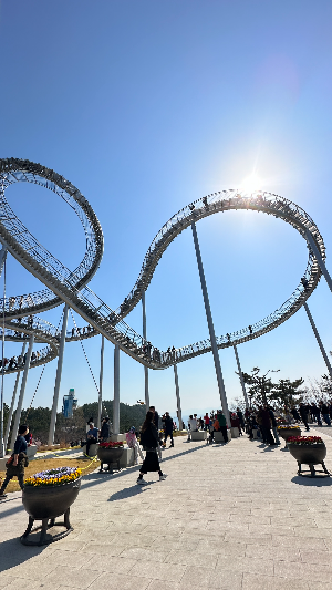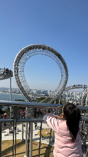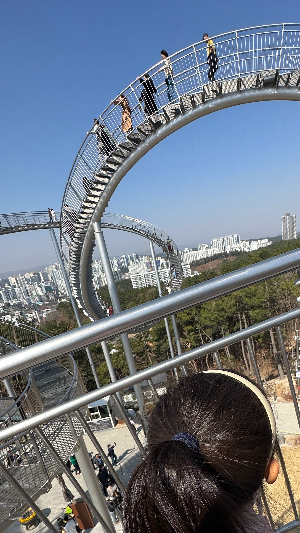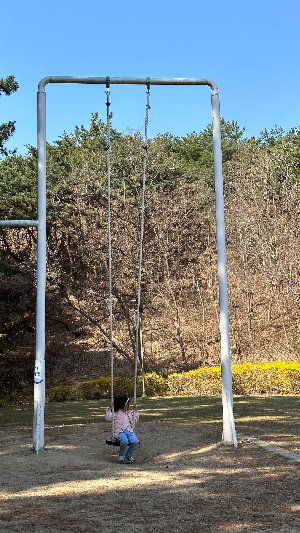 오늘은 다행히 가능해서 가보았습니다. 처음에 네이버 지도를 통해 주차장을 확인하고 출발하였는데, 검색 시에 환호공원 주차장 1, 환호공원 1 주차장 이렇게 글자 앞뒤 차이로 완전 다른 주차장이어서 원래 생각한 주차장과 다르게 잘못입력하고 환호공원주차장 1에 도착하여 보니 산책로 입구가 나와 당황했습니다. 아이들은 대형 그네 타고 싶다고 앉아서 사진도 남기고ㅎㅎ