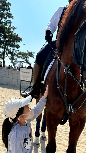 한창 구경하고 있는데 모래사장에 말이 나타나서 애들이 신나서 모여들었습니다.