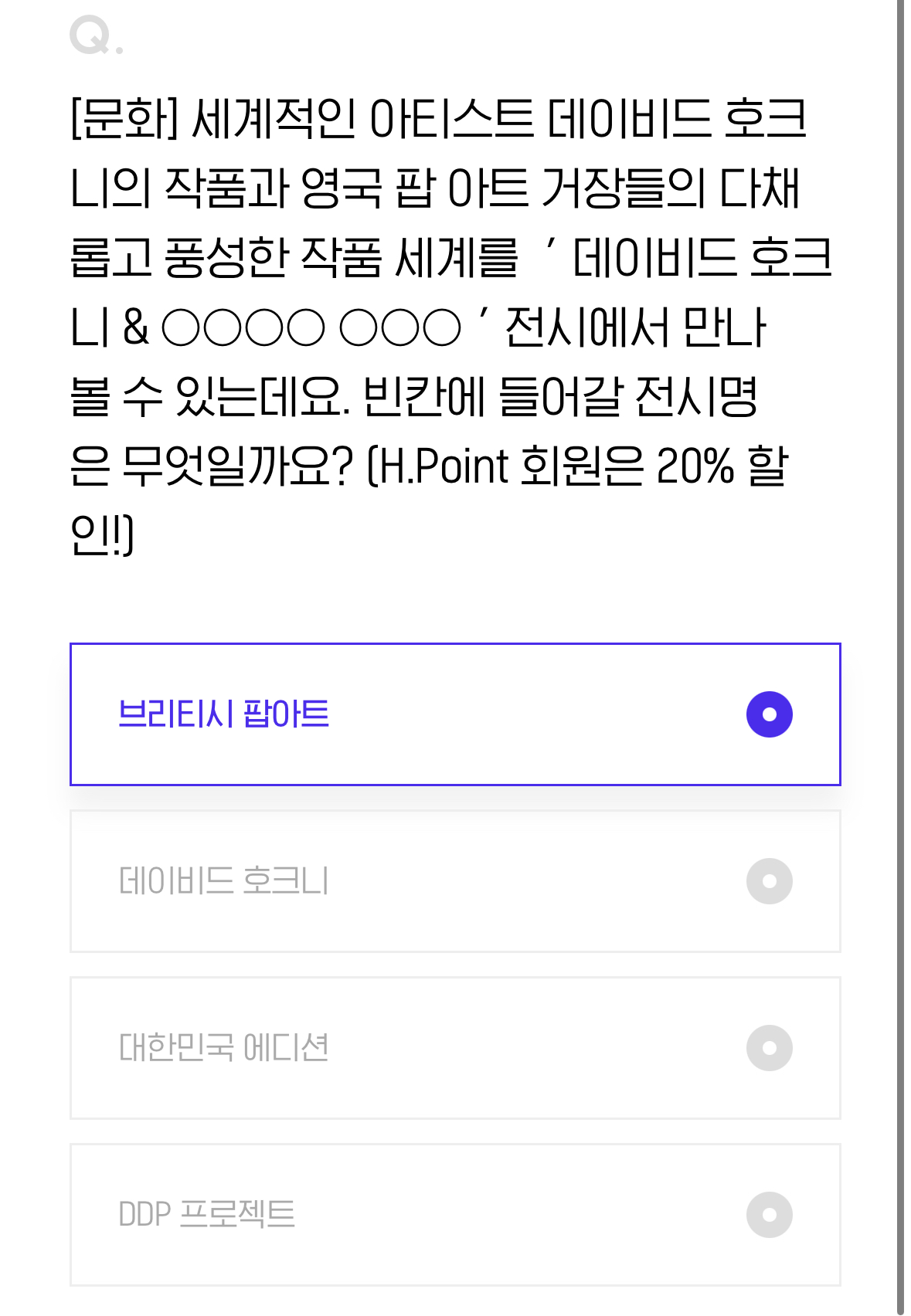[문화] 세계적인 아티스트 데이비드 호크니의 작품과 영국 팝 아트 거장들의 다채롭고 풍성한 작품 세계를 '데이비드 호크니 & ○○○○ ○○○'전시에서 만나볼 수 있는데요. 빈칸에 들어갈 전시명은 무엇일까요? (H.Point 회원은 20% 할인!)