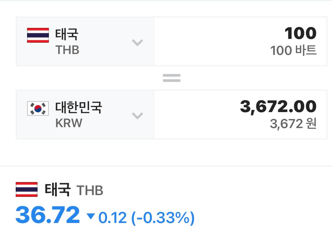 태국돈에서 40을 곱하면 한국 원화로 계산이 가능해요. 예를 들어서 65바트가 나왔다면 한국돈으로는 대략 65바트 X 40 =2,600원이 되는 것입니다. 반대로 원화를 태국 돈으로 바꿀 때는 나누기 40을 하시면 됩니다.